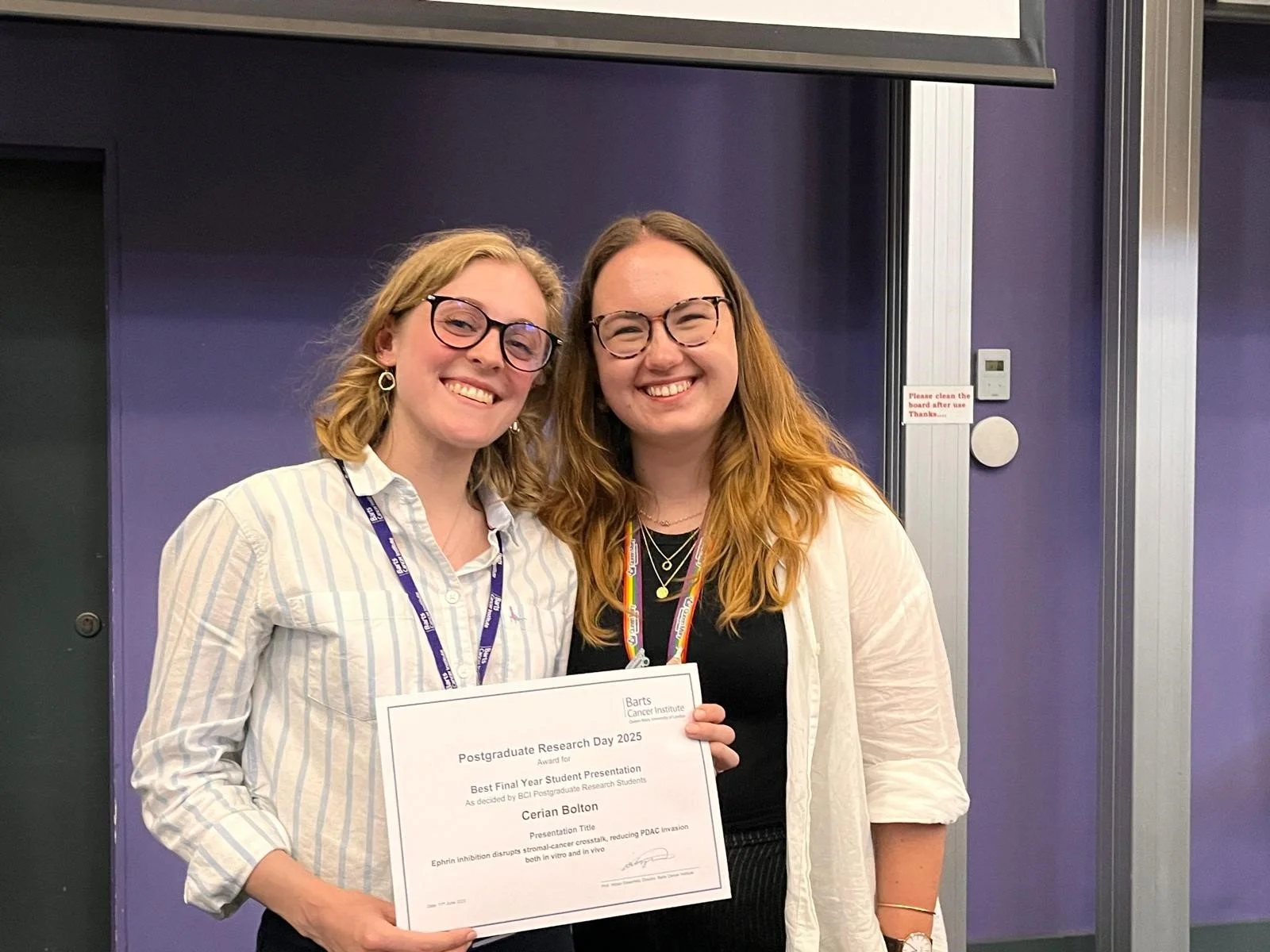 Well done to Shayin and Elena who have won prizes at the BCI PhD day, presenting their PhD projects on DCIS and pancreatic cancer! Shayin won best poster presentation and Elena won best talk!